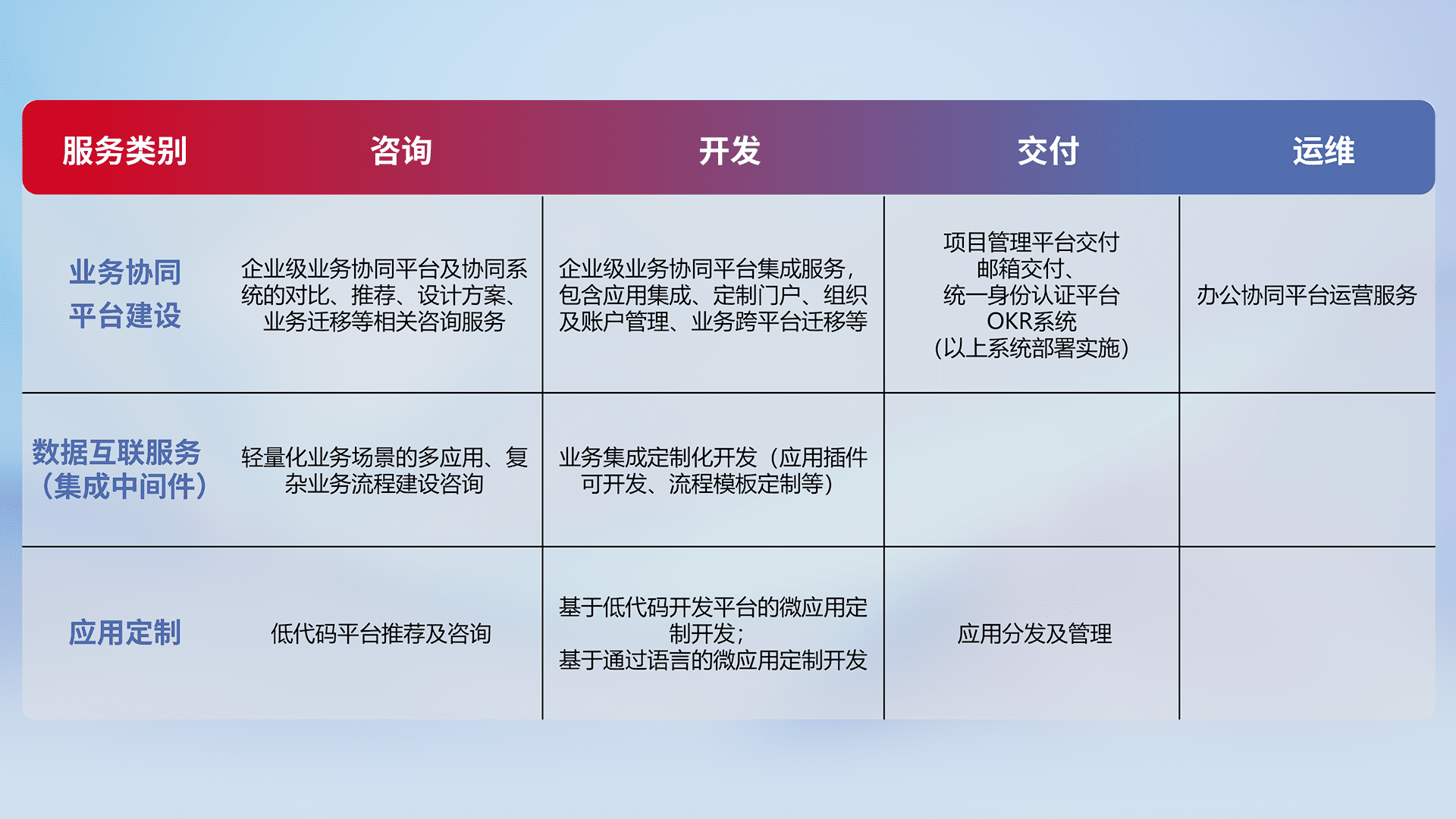 针对钉钉、、企微、、、IDaas等平台级产品提供产品的规划、、、方案、、、、交付、、、定制化开发等服务,,,,实现如统一协同办公、、智能客户服务、、、、混合会议管理、、智能数据查询、、等业务场景,,,实现数字化转型。。。